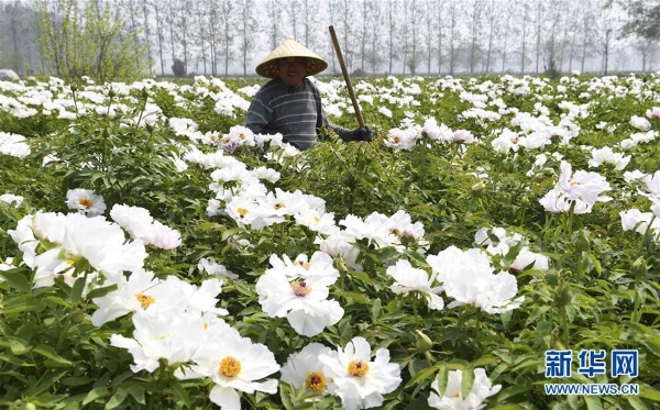 4月8日,在安徽亳州市谯城区十八里镇现代农业综合开发示范区,农民在药用牡丹地里劳作。 新华社发(刘勤利 摄)