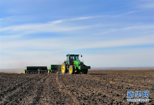 4月8日,黑龙江垦区五大连池农场的职工驾驶农机播种小麦。 新华社发(陆文祥 摄)