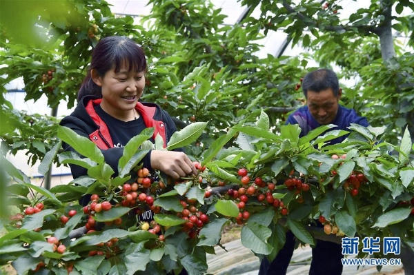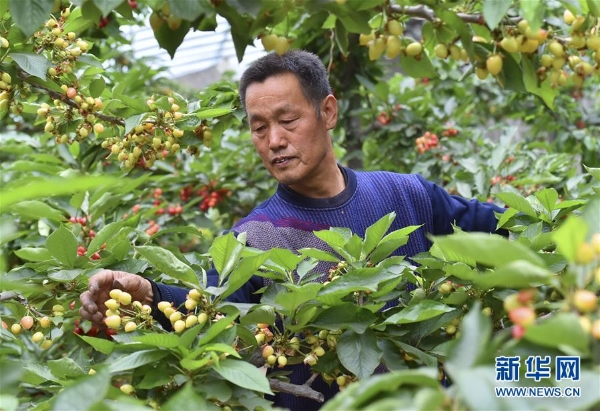 4月8日,在河北省石家庄赞皇县土门乡龙堂院村的樱桃种植园里,果农在管护樱桃。 新华社发(张晓峰 摄)