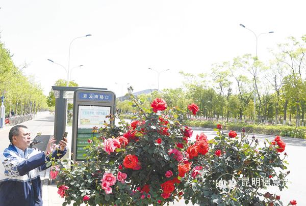 图为彩云南路口公交车站被盛开的月季花簇拥,行人忍不住拍照定格这春天的美好。记者杨艳辉摄影报道