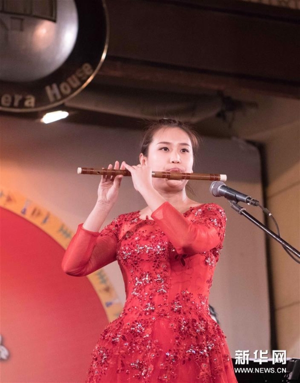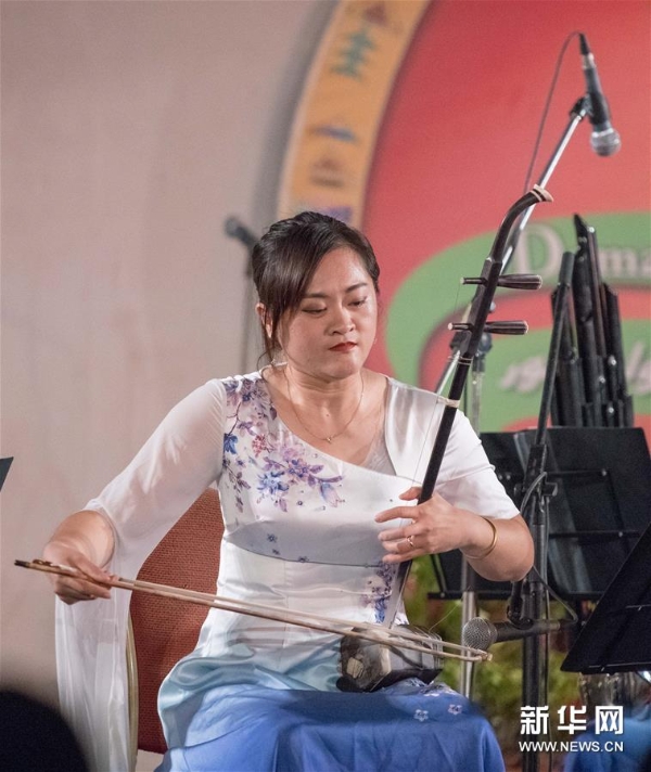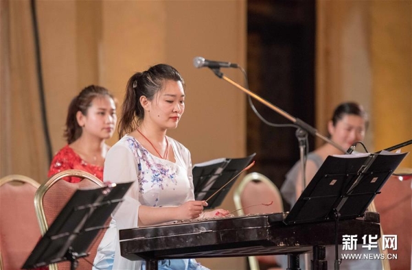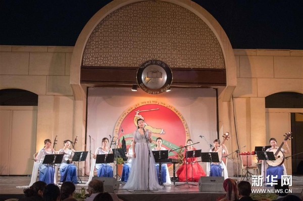 4月8日,在埃及首都开罗,中国江苏女子民族乐团的演员在舞台上表演。新华社记者邬惠我摄