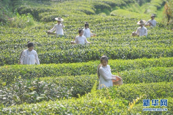 4月9日,在武夷山市天心村莲花峰下,武夷山旅游职业中专学校学生在采茶。 当日,福建省武夷山市举行“喊山祭茶”活动,吸引不少游客身着传统服饰前来体验采茶。 新华社记者 宋为伟 摄