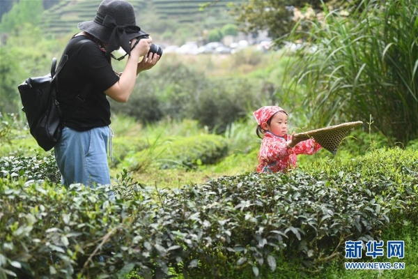 4月9日,在武夷山市天心村莲花峰下,游客在为采茶的小朋友拍照。 当日,福建省武夷山市举行“喊山祭茶”活动,吸引不少游客身着传统服饰前来体验采茶。 新华社记者 宋为伟 摄