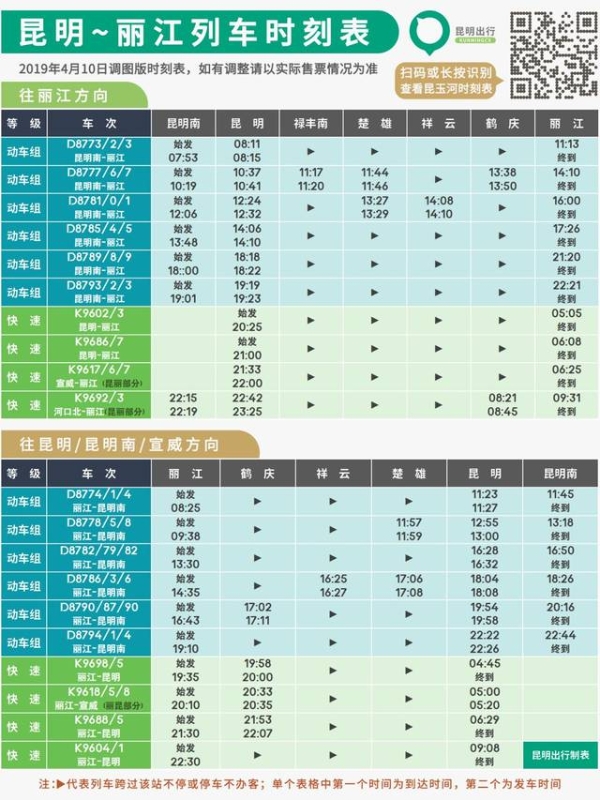 本次调图的变化,除了增开昆明至丽江动车外,昆明至曲靖的Z字头城际列车将有2对延伸至宣威,旅客在昆明和宣威之间往返更加快捷;同时,原来16:03始发的蒙自动车调整至18:15始发,使目前开行的三趟蒙自动车均衡覆盖早、中、晚时段,方便旅客出行。