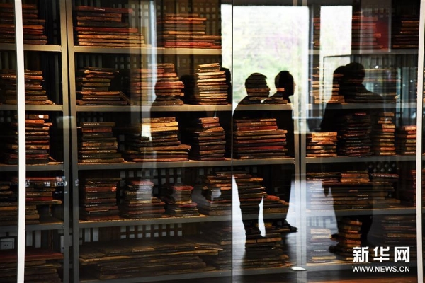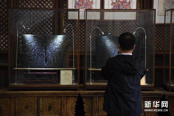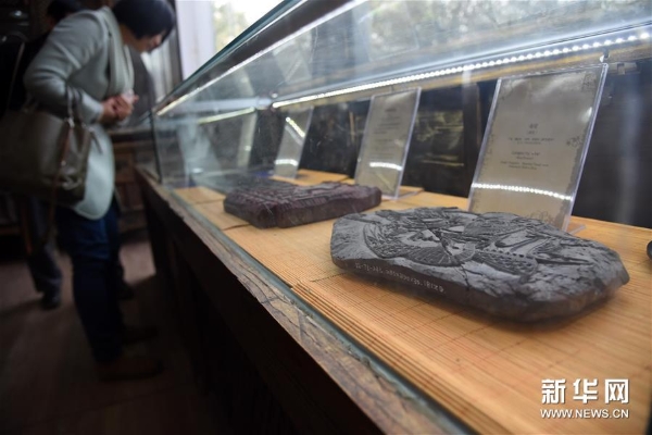 4月10日,参观者在山东艺术学院年画艺术研究中心的研究基地——山东艺术学院年画雕版博物馆里参观。新华社记者 王凯 摄