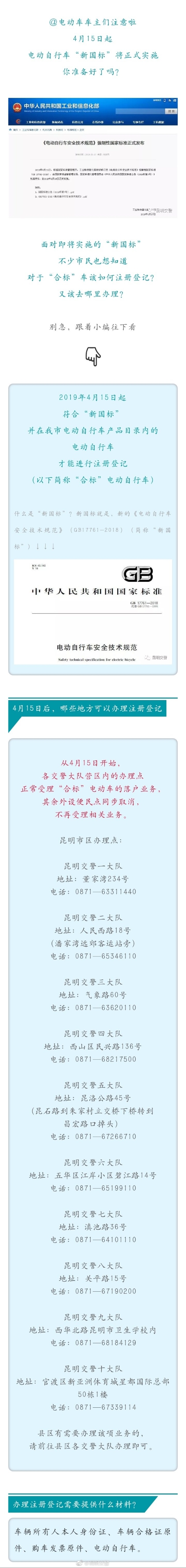 昆明交警4月12日曾在微博上发文称:【注意!4月15日起实施“新国标”,“合标”电动自行车登记需符合这些要求……】《电动自行车安全技术规范》(GB17761-2018)(简称“新国标”)将于2019年4月15日开始实施,届时,新购的电动自行车必须符合“新国标”方能办理注册登记。