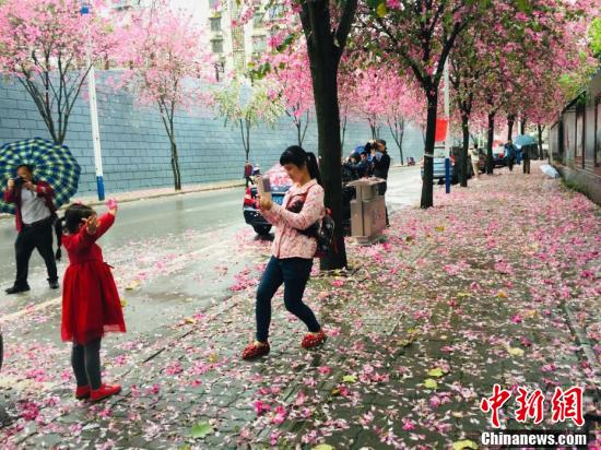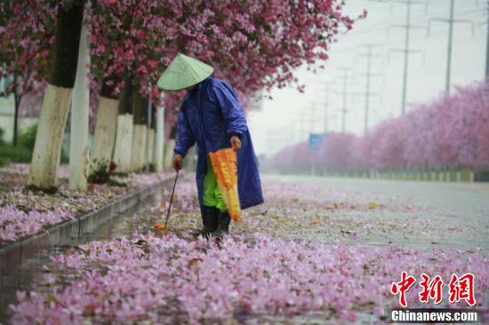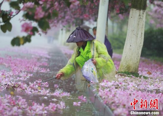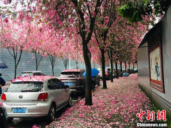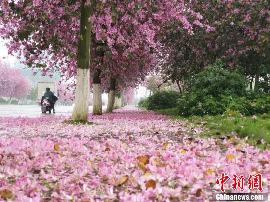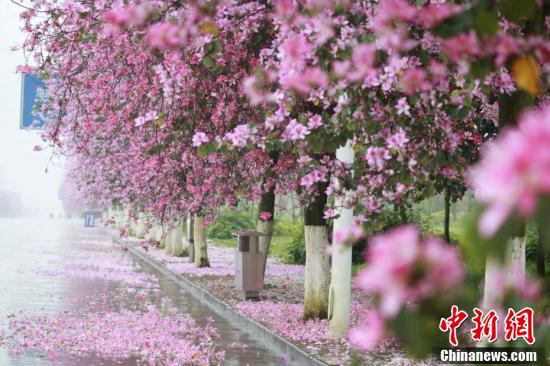 紫荆花如雨般凋落,道路变成粉红色。