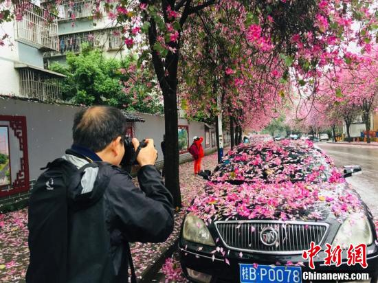 4月14日,一场大雨降临广西柳州市,27万株绽放的紫荆花伴随着雨点飘落,好似“紫荆花雨”一般。道路上铺满的紫荆花与树上的粉红相映成趣,停放在紫荆树下的车辆,被花瓣装点得犹如“花车”。图为柳州市鱼峰区葡萄山路紫荆花如雨般纷纷凋落。