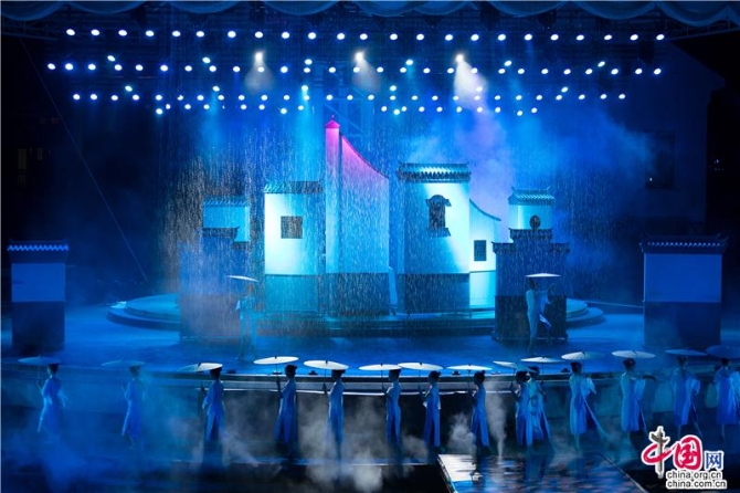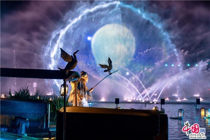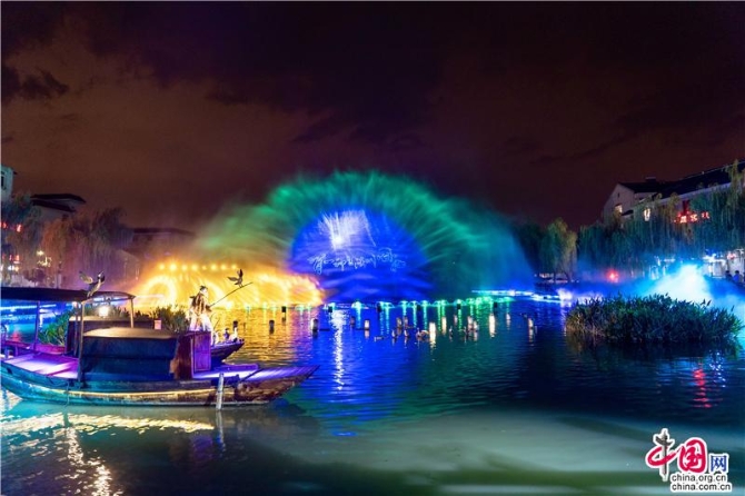 遥知未眠月,乡思在渔歌。一场光、水、影共舞的“蚬江渔唱”,让渔家生活升华在水光的诗意和灯影的绚丽里。渔歌悠扬,透过水幕光影,周庄跨越千年,从水中走来。