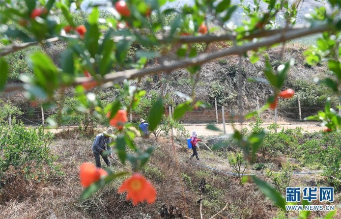4月8日,在云南弥勒朋普镇庆来村的荒山上,工人在石榴果树林中劳作。记者杨宗友摄