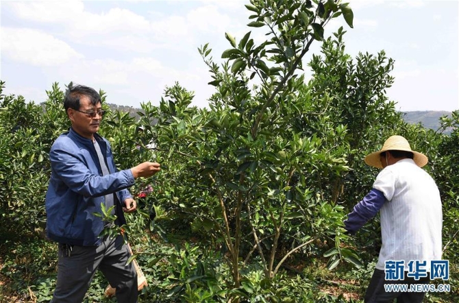 4月8日,在云南弥勒朋普镇可乐村的荒山上,工人在修剪柑橘树枝叶。新华社 记者杨宗友摄