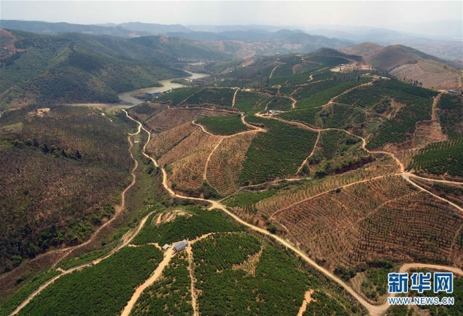 这是4月8日无人机拍摄的云南弥勒朋普镇可乐村荒山上的果园。新华社 记者杨宗友摄