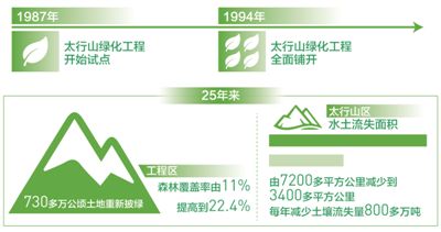 和天保工程、三北防护林工程一样,太行山绿化工程是我国正在实施的林业重点生态工程。25年来,工程区森林覆盖率由11%提高到22.4%,森林质量显著提升,林区生态环境明显改善。