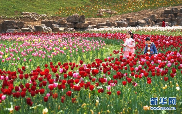 4月14日,游客在位于湖北省十堰市茅箭区的秦巴生态植物园内赏花游览。近日,位于湖北省十堰市茅箭区的秦巴生态植物园内,200万株郁金香竞相开放,吸引游客前来赏花游览。以上照片均由新华社记者 程敏/摄