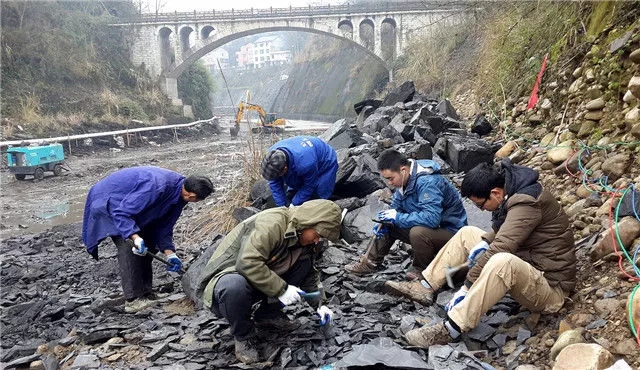 2014年,西北大学地质学系的师生在湖北省宜昌市丹水河进行“清江生物群”化石挖掘。新华社发(西北大学供图)