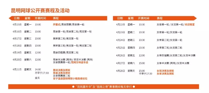 据悉,2019昆明网球公开赛为期两周,包括最高级别的ATP挑战赛(4月15日至21日)和WTA125K系列赛(4月22日至28日)。男子比赛总奖金额已经提升至162,480美元,是最顶级的ATP挑战赛之一;女子比赛则于去年升级为总奖金为125,000美元的WTA125K赛事,这是WTA级别的赛事首次落户中国西南地区。