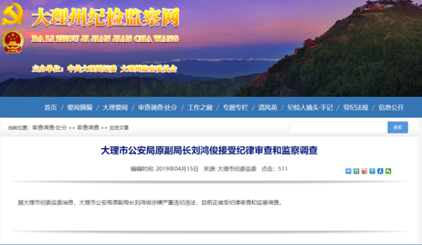 昆明信息港讯 据大理市纪委监委消息,大理市公安局原副局长刘鸿俊涉嫌严重违纪违法,目前正接受纪律审查和监察调查。