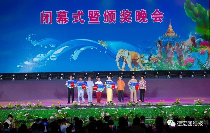 出席闭幕式的领导为在泼水节期间举办的“德宏美”傣族歌曲征集大赛、“金旺旺”傣族美食大赛、寻找“最美孔雀公主”大赛、第二届“丝路光影”国际微视频德宏影展等各项比赛获奖者,以及为本次泼水节的成功举办作出积极贡献的企业代表颁奖。州政协主席、中国·德宏2019国际泼水狂欢节组委会主任黄丽云致闭幕词。