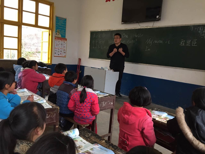 △公安部办公厅秘书处主任科员、贵州黔西南州兴仁县新龙场镇民裕村第一书记程显臣。去年他在打好精准脱贫攻坚战座谈会上发了言。这是程显臣在民裕小学的第一堂英语课。2017年3月左右,因村小学没有英语教师,程显臣便在村小学每周教两节英语课。