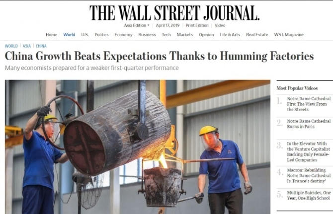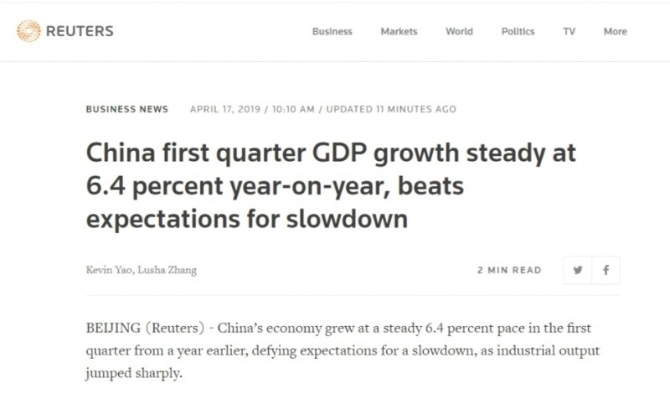 国家统计局17日公布了2019年一季度中国经济“成绩单”。初步核算,一季度国内生产总值213433亿元,按可比价格计算,同比增长6.4%。此前,市场普遍预期中国GDP增速为6.3%。外媒认为,中国经济回暖速度超出市场预期,企稳迹象明显。