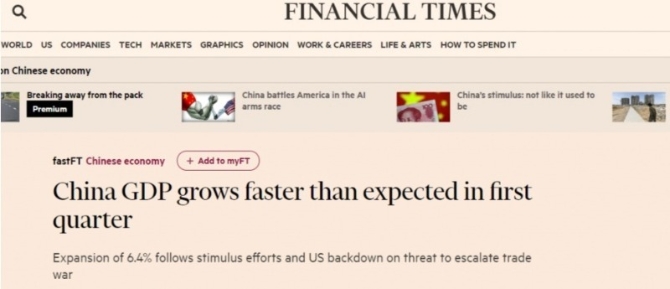 英国《金融时报》网站4月17日报道称,中国国家统计局周三公布,今年第一季度,中国经济同比增长6.4%,高于路透社预测的6.3%,这说明政府刺激措施开始生效。