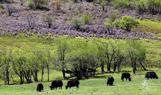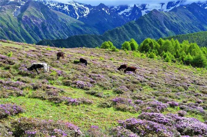 在这里,还有一座雪山,叫白马雪山,这里有全国最美的高山杜鹃林。春夏季杜鹃怒放,沁人心脾。秋冬时节,林区各色树木五颜六色,非常漂亮。