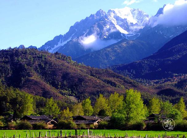 在这里,有一座中国最南端的雪山——玉龙雪山,它山腰云腾雾绕,山势连绵起伏,远望似银龙飞舞,气势壮观。