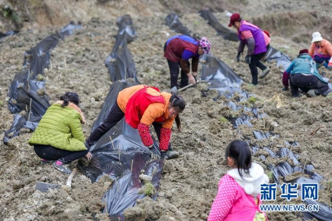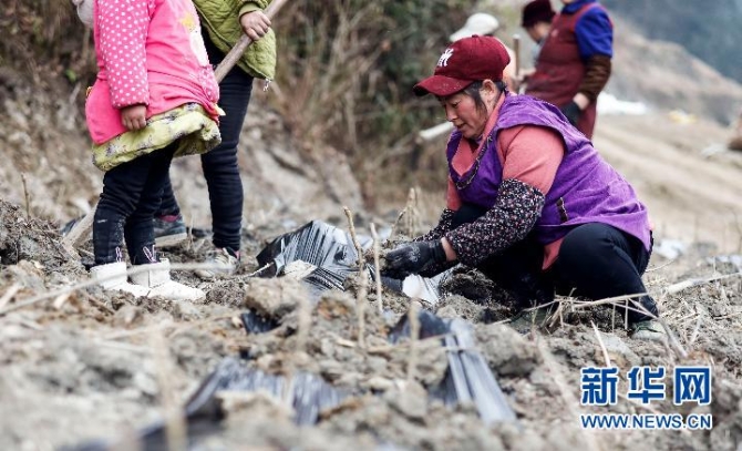 重庆黔江区金溪镇长春村村民在平整出来的田地里栽种桑树苗(1月24日摄)。