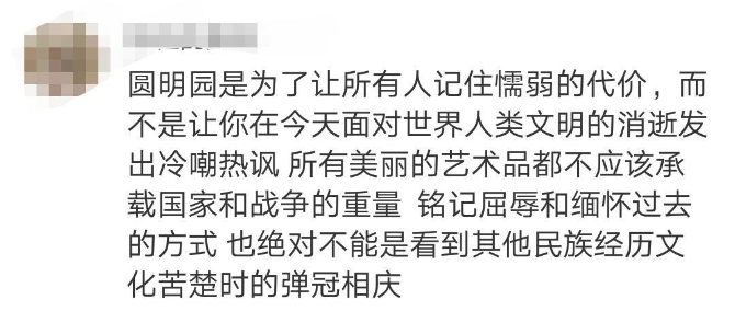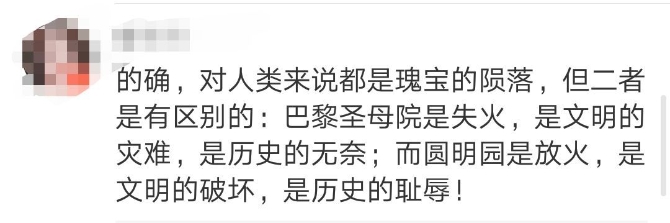 这一刻的中国人,怎能不想起,背负了一百多年圆明园烧毁的心灵创伤,何其艰难、何其罔然,可惜圣母院,可惜圆明园,文化不应该这样毁灭,更不应该人为践踏。