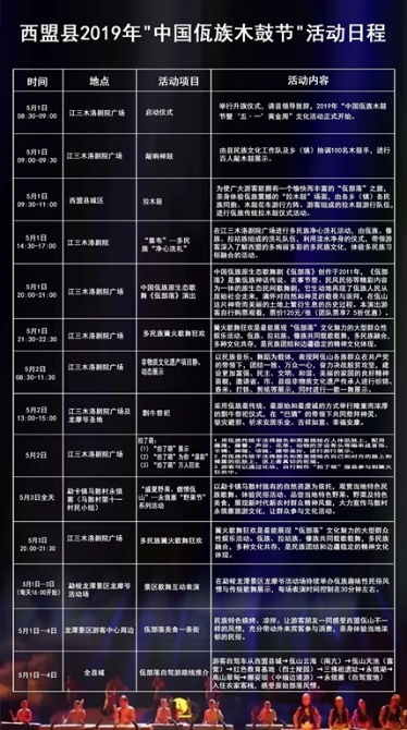 5月1日,在江三木洛剧院广场将举行升旗仪式,以宣布西盟县2019年“中国佤族木鼓节暨‘五•一’黄金周”文化活动正式启动。届时,100名来自佤族的同胞,将进行百人敲木鼓展示。同时,由佤族、傣族、拉祜族组成的洗礼队伍,利用泼水净身的仪式,带领游客深入了解西盟的多绚丽多彩的多民族文化,体验多民族习俗融合的活动。除此之外,中国佤族原生态歌舞《佤部落》演出,将生动再现佤族人民从原始社会走来,满怀对自然和神灵的敬畏与崇拜,在佤山这片神奇而美丽的土地上繁衍生息的历史过程。演出时间为5月1日的20:00—21:00。