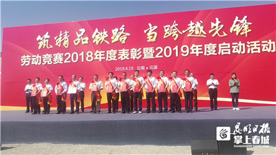 当天,由云南省总工会、中国铁路昆明局集团共同组织开展的“筑精品铁路 当跨越先锋”劳动竞赛2018年度表彰暨2019年度启动活动在永广铁路元谋西站举行,云南省政府、云南省总工会、楚雄州相关部门负责人现场进行了颁奖。中铁电气化局集团有限公司等5家建设单位荣获“云南省五一劳动奖状”,15人荣获“云南省五一劳动奖章”,20个单位荣获“云南省工人先锋号”,100人荣获“云南铁路建设先进个人”。