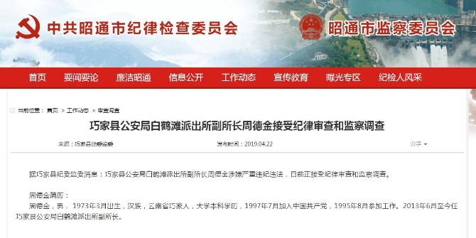 巧家县公安局白鹤滩派出所副所长周德金接受纪律审查和监察调查