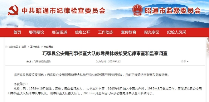 巧家县公安局刑事侦查大队教导员林毅接受纪律审查和监察调查