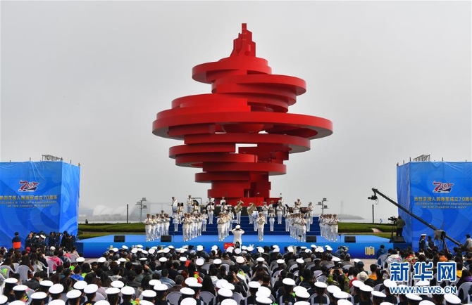 4月22日,庆祝人民海军成立70周年中外海军联合军乐展示在山东青岛五四广场举行。