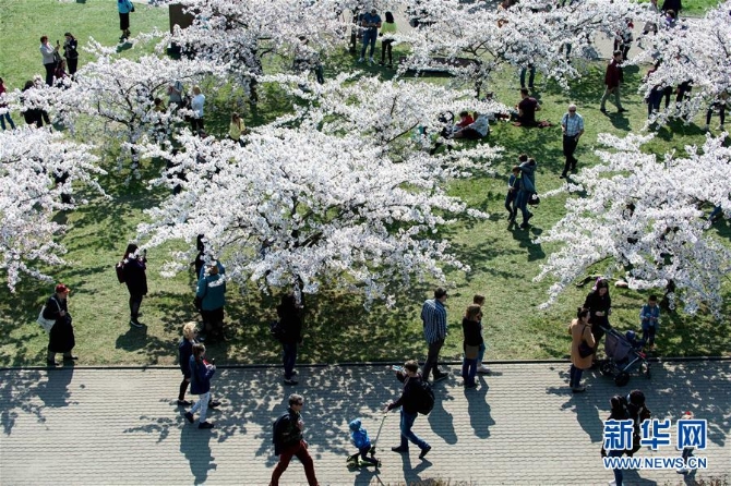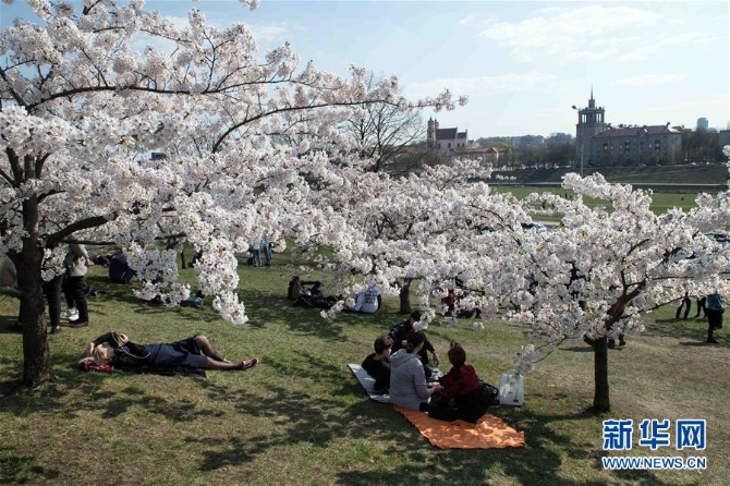 4月22日,人们在立陶宛维尔纽斯一座公园里观赏樱花。近日,立陶宛天气转暖,首都维尔纽斯樱花盛开,吸引人们前来观赏。新华社发 阿尔弗雷达斯·普里亚迪斯