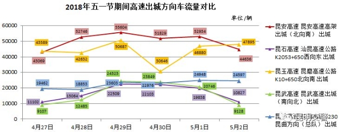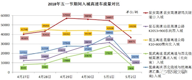 从上图可以看出,2018年五一节期间,经由昆安高速入城的车流量最大,并在五一节首日(4月29日)达到高峰;昆玉高速车流量略低于昆安高速,节假日期间整体较平稳;昆石、昆曲、昆武高速车流量相差不大,均明显低于昆楚、昆玉两条高速的车流量,三条高速的车流量均在节假日末日(5月1日)达到高峰。