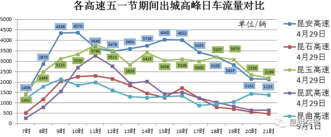 从各高速五一节期间入城高峰日车流量对比情况可以看出,昆安高速、昆曲高速车流量在高峰日18时达到最大,昆石高速和昆武高速在高峰日11时车流量达到最大,昆玉高速在高峰日9时达到最大。