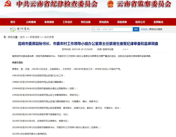 昆明信息港讯 据昆明市纪委监委消息:昆明市委原副秘书长、市委农村工作领导小组办公室原主任蔡德生涉嫌严重违纪违法,目前正在接受纪律审查和监察调查。