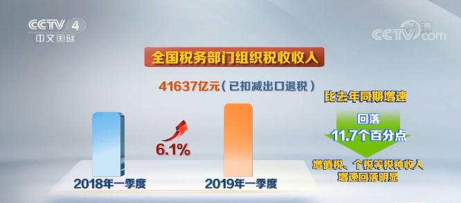 随着大规模减税政策的大规模落地,税收收入增速明显回落。一季度,全国税务部门组织税收收入41637亿元(已扣减出口退税),增长6.1%,比去年同期增速回落11.7个百分点,增值税、个税等税种收入增速回落明显。