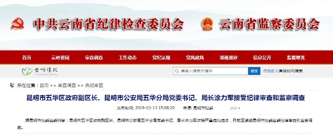 今年2月13日,昆明市五华区人民政府副区长、昆明市公安局五华分局党委书记、局长涂力军涉嫌严重违纪违法,接受纪律审查和监察调查。