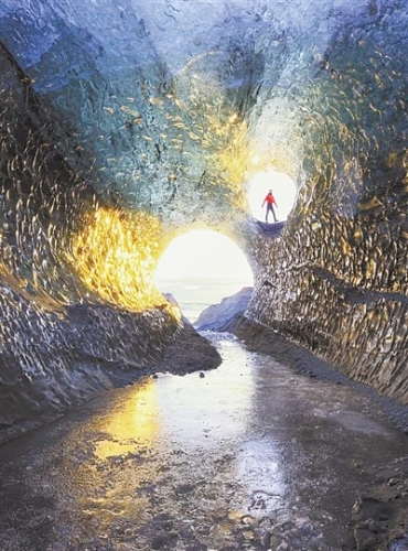 43岁的Sigurur William Brynjarsson前往冰岛瓦特纳冰川国家公园,拍摄到一组美到窒息的画面。据Sigurur介绍,这些冰洞是由冰川融水从冰川底部流淌形成的。洞穴在夏天被淹没,在冬天会结冰。由于冰川的重量挤压了冰的所有氧气,因此最底层的冰变成了蓝色。当阳光照射在冰川上时,蓝冰洞就会散发出金色的光芒,犹如异度空间。