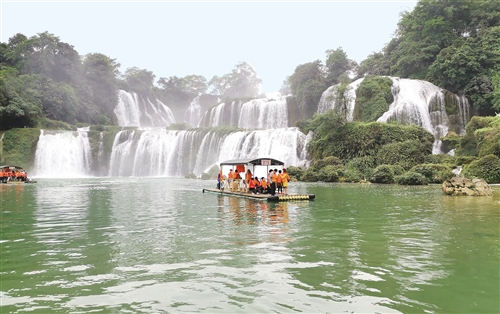 中越边境线上的德天跨国瀑布宽308米,三级落差70米,纵深60米。图为游客在观赏瀑布美景。