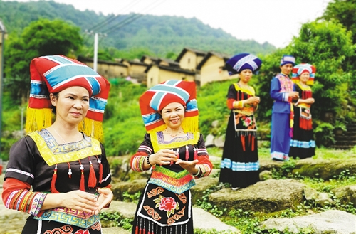 上林县鼓鸣寨景区,穿着壮族传统服装的村民正在迎接游客。
