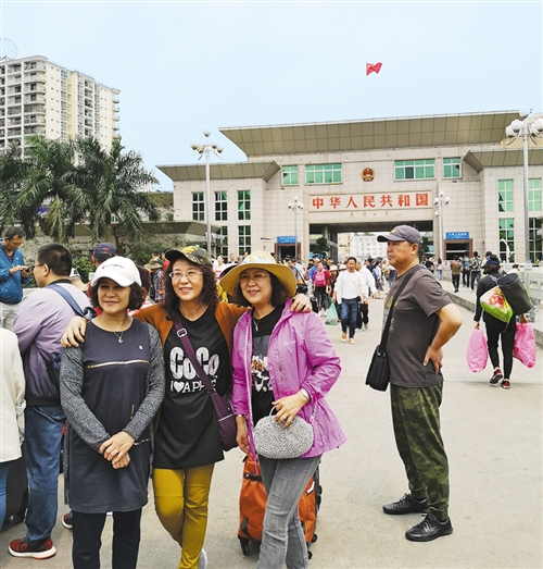中越友谊大桥上,赴越南一日游的游客在合影留念。
