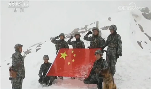 这次巡逻的终点3号点位界碑在别迭里达坂的山脊。从山脚出发爬上去虽然只有300多米的距离,但越往上空气越稀薄,每走一步,双腿都像灌了铅一样,所以战士们称这里为“好汉坡”。经过1个小时的攀爬,巡逻官兵终于登上了别迭里达坂,见到界碑的那一刻,难掩心中激动的心情。官兵们先对界碑进行描红,拉克则在一旁默默的注视着,俨然是一名庄严的战士。