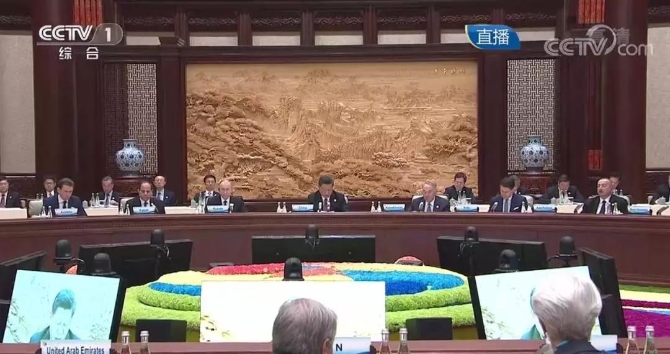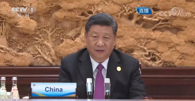 习近平说,2017年5月,我同在座许多领导人一起,在此举行了首届高峰论坛圆桌峰会,发表了联合公报,确立了共建“一带一路”的目标、原则、举措,达成了多项具体成果。