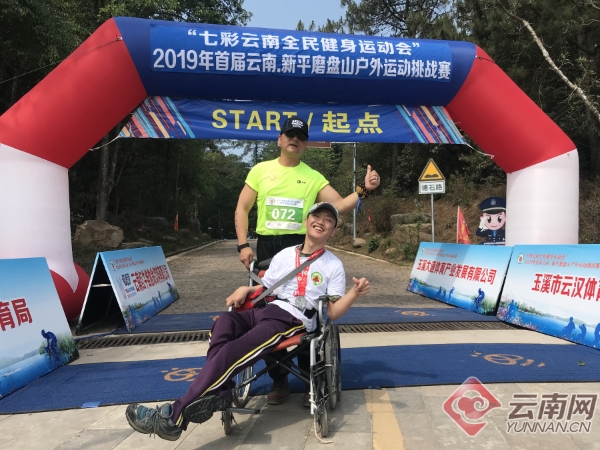 来自昆明的王管亮一家带着今年20岁的儿子王成报名参赛。王成小时候因意外成为一名脑瘫患者,多年来,爸爸在悉心照顾他生活的同时,推着他到全国各地参与户外运动比赛。王成的父亲高兴地说:“磨盘山的空气十分清新,满眼绿色,仿佛是一个天然的大氧吧,我和儿子都玩的十分开心,其实我们也是本着旅游的态度来的,参赛的同时顺道游览磨盘山以及周边景区,感受这里的风土人情,希望积极健康的运动氛围能够感染他。”