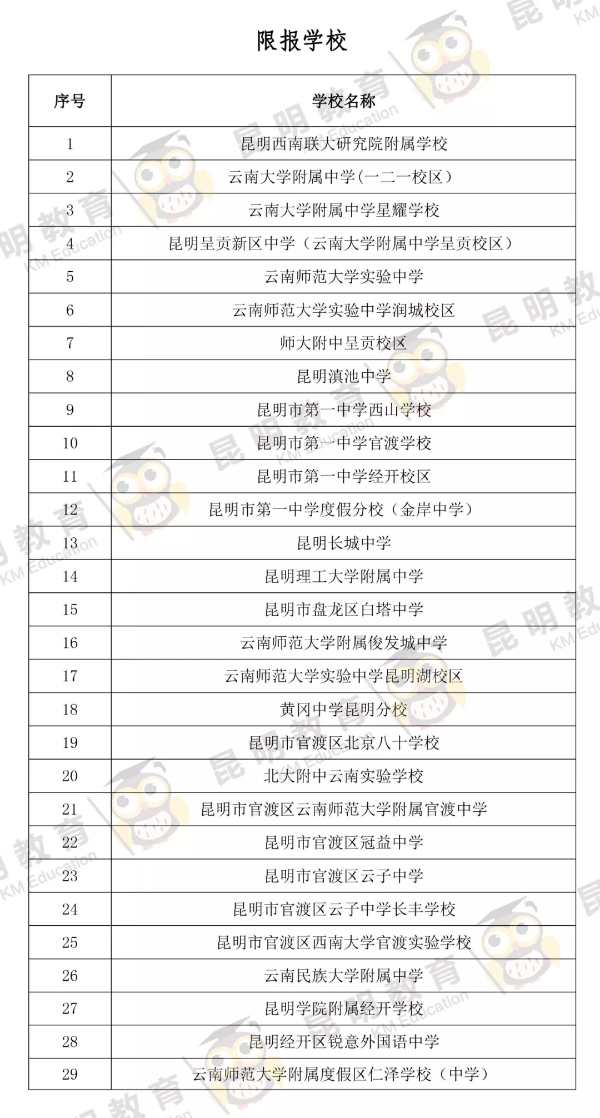 昆明信息港讯(昆明日报)昆明市2019年限报民办初中名单出炉啦!5月6日—10日登录:昆明市义招网(www.kmyzw.cn)即可报名。记者为你整理好了2019年昆明市初中招生的最新政策及限报民办初中名单。