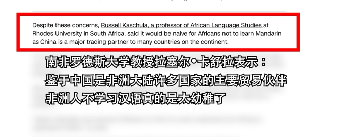 CNN援引南非罗德斯大学的非洲语言研究教授拉塞尔•卡舒拉的话说:“鉴于中国是非洲大陆许多国家的主要贸易伙伴,非洲人如果不学习汉语就有些无知了。”