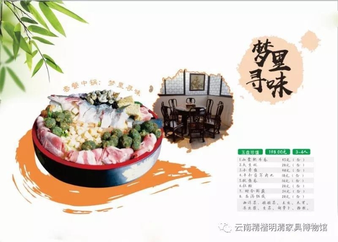 在时代的浮沉中,中国人习惯用食物缩短他乡与故乡的距离,云南精楷明清家具博物馆的海鲜火锅把每一种他乡的食材结合本味在加上云南人爱吃的宣威火腿小米辣等调料进行综合串联,食材通过舌尖上的味蕾传遍全身,其中滋味已印入脑海,令人久久难忘。吃的是滋味品的是文化-------